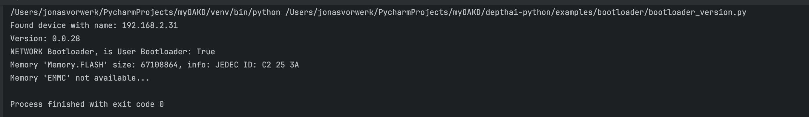 [2024-07-18 13:59:23.911] [depthai] [debug] Searching for booted device: DeviceInfo(name=192.168.2.31, mxid=18443010A136E3F400, X_LINK_BOOTLOADER, X_LINK_TCP_IP, X_LINK_MYRIAD_X, X_LINK_SUCCESS), name used as hint only