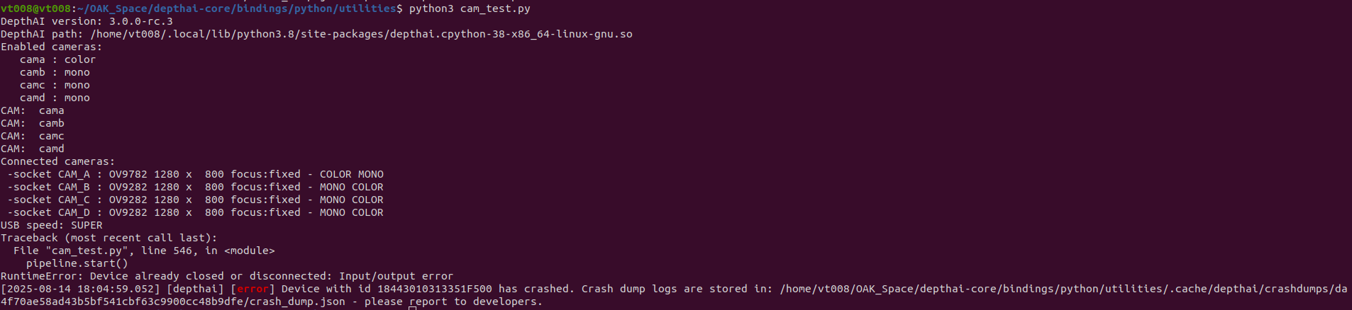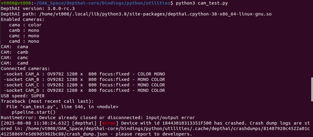[2025-08-08 11:38:24.632] [depthai] [error] Device with id 18443010313351F500 has crashed. Crash dump logs are stored in: /home/vt008/OAK_Space/depthai-core/bindings/python/utilities/.cache/depthai/crashdumps/81407920c4522a01c412588697e5d69d5982bc88/crash_dump.json - please report to developers.