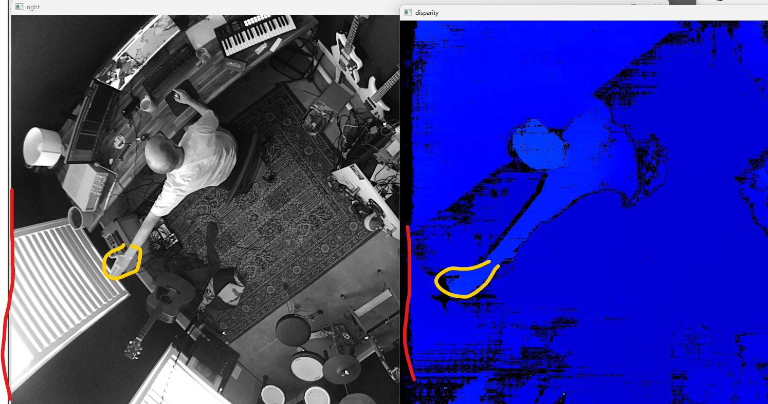 jakaskerl NickDeboar The wide stereo cameras are undistorted and rectified. A lot of FOV is lost because there is a lot of distortion on these cameras. You can add thisstereo.setAlphaScaling(1) to show the whole (even invalid) depth. Thanks, Jaka