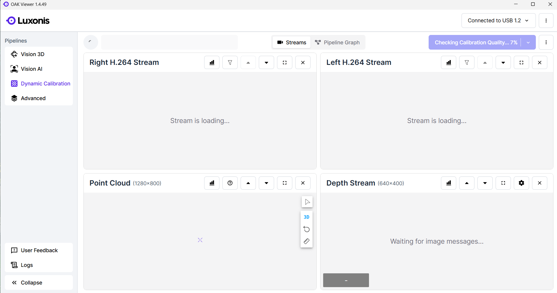 When attaching an OAK-D-PRO into OAK Viewer 1.4.49, there is no Dynamic Calibration dropdown menu as pictured above, rather a tab for "Connected to USB 1.1" and the 3 vertical dots stacked to each other.