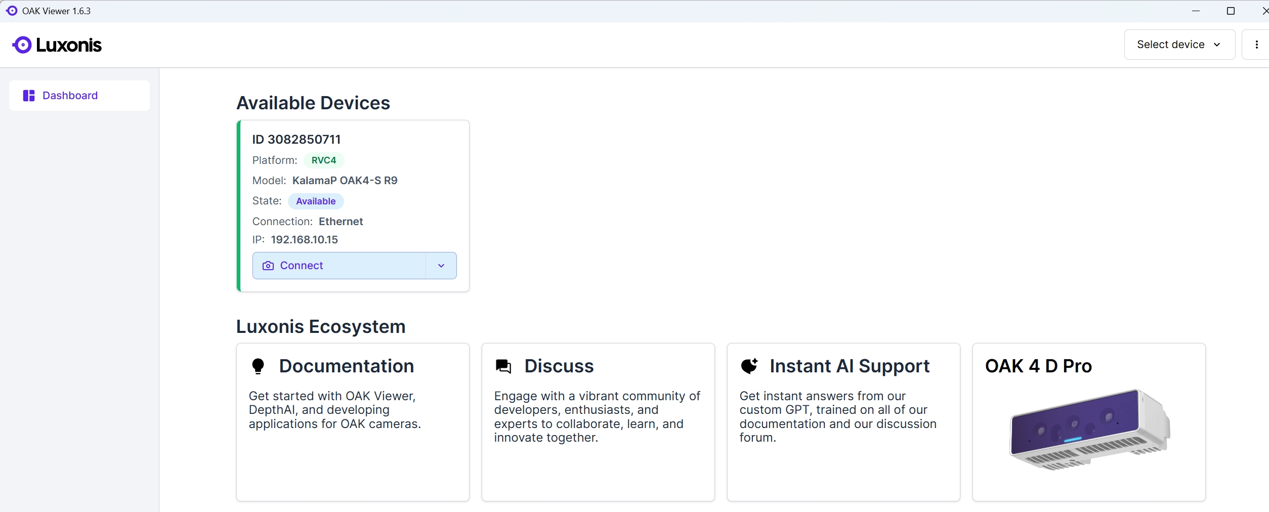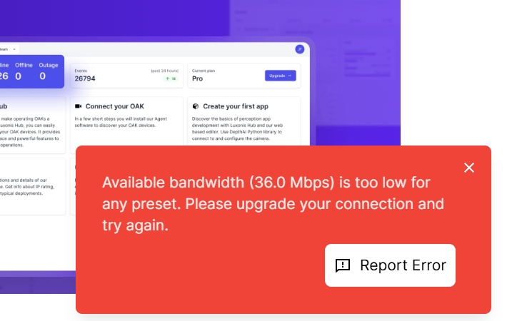 After completing the configuration steps shown in the diagram, I can obtain device information in the OAK viewer 1.6.3 APP, but when attempting to connect, it prompts "Available bandwidth (36.0 Mbps) is too low for any preset. Please upgrade your connection and try again.".