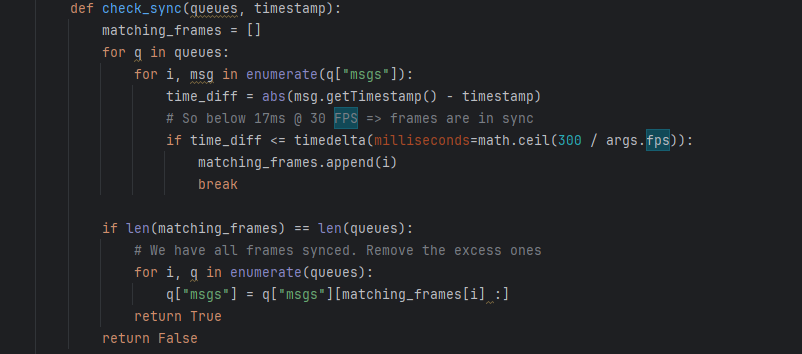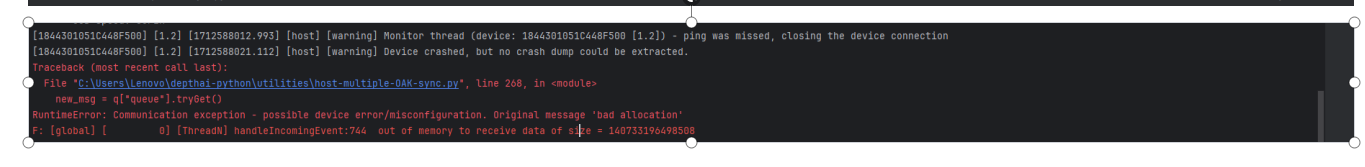 The frame rate of the 4 cameras is 30fps, which is basically the same as host-multiple-OAK-sync1.py. I want to set the sync precision to 10ms, so I set the value here to 300, but sometimes the above problem occurs. Is the sync precision set too high?